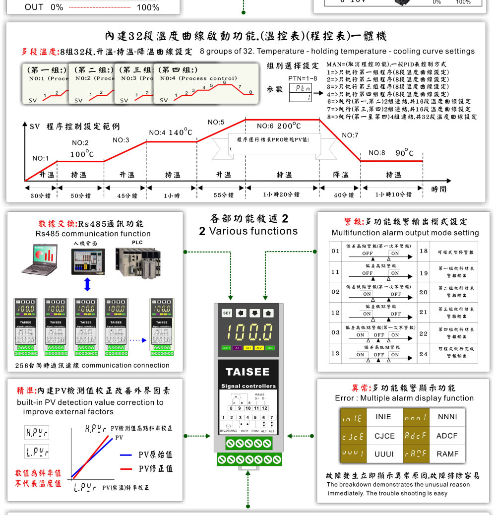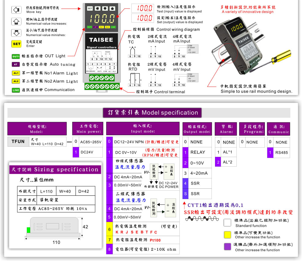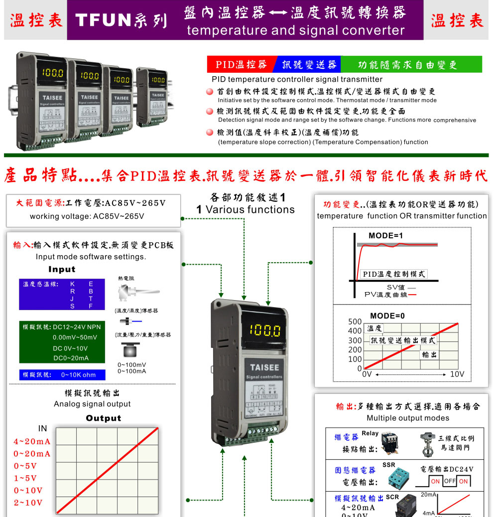 溫度.濕度.流量.各種訊號 (485通訊功能) (多種輸入模式設定) 比例式(模擬訊號)輸出 盤內卡軌式
